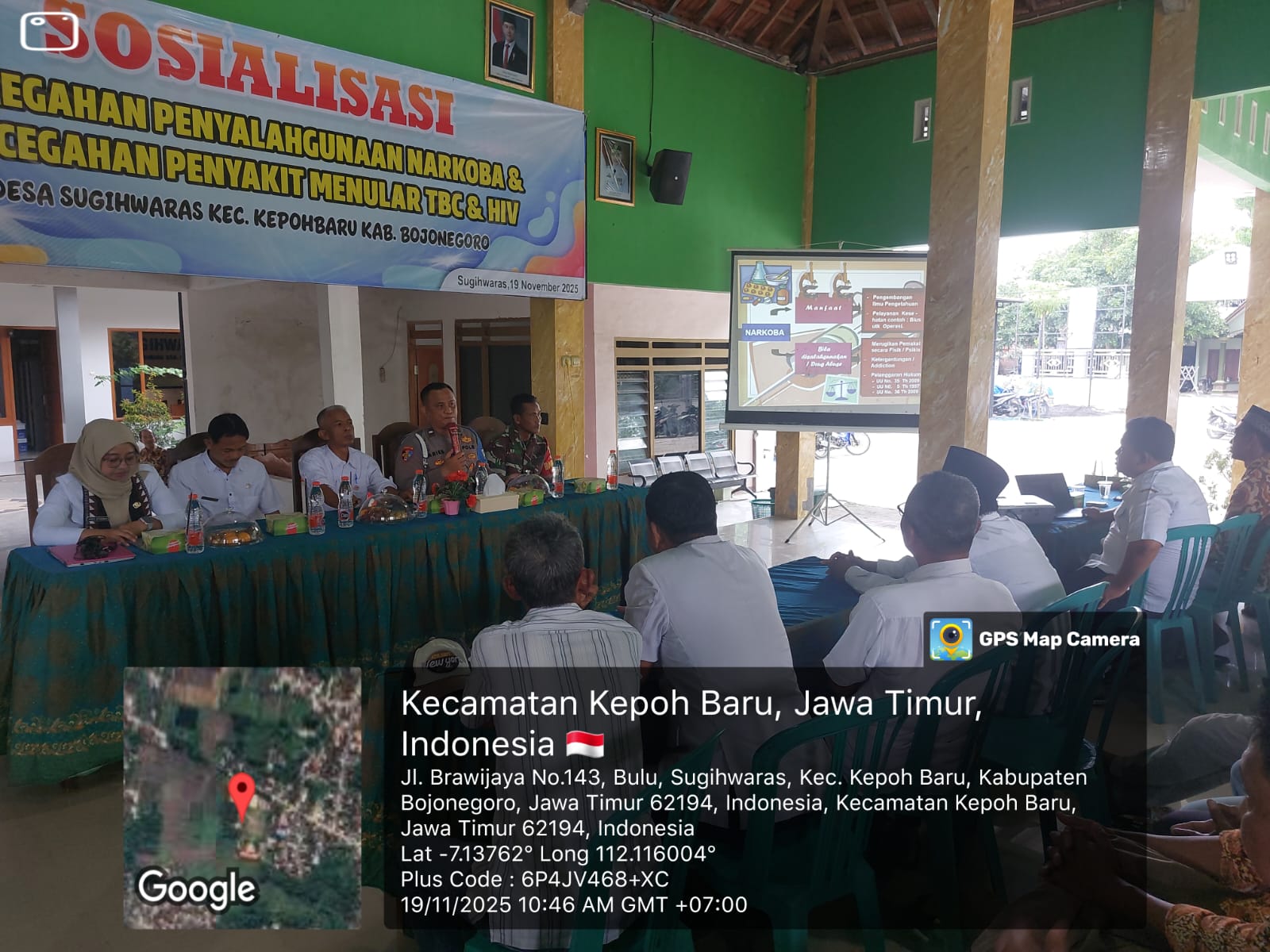 Rabu 19 Nopember 2025 Pemerintah Desa Sugihwaras bersama Polsek Kepohbaru dan Puskesmas Kepohbaru mengadakan kegiatan Sosialisasi Penceahan Penyalahgunaan Narkoba dan Pencegahan Penyakit Menular Tuberkulosis (TBC) bertempat di pendopo balaidesa Sugihwaras. Kegiatan dimulai pukul 10.00 WIB dihadiri oleh Bhabinkamtibmas, Babinsa, Pengurus RT/RW, PKK, Kader Posyandu Tokoh Masyarakat dan Karangtaruna.